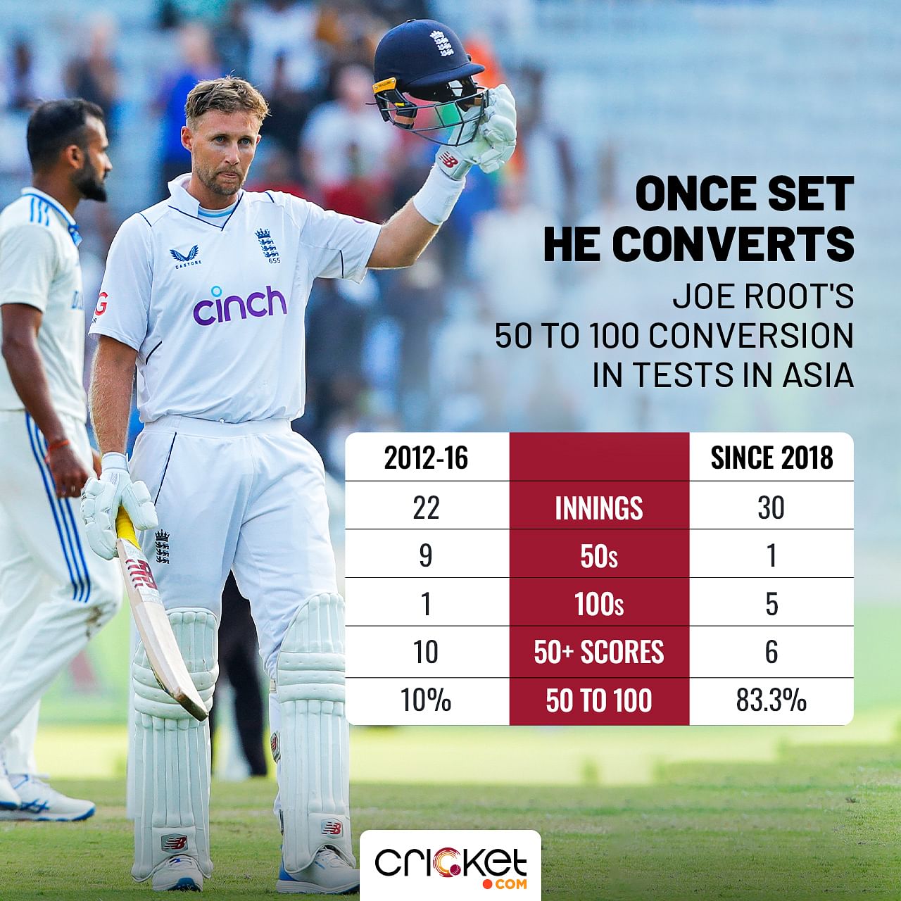 In Tests since 2011, among 35 centuries by a visiting batter against India, only three have had a better control percentage than Root (92.5%). Cameron Green (114 with 95.3%) in 2023 in Ahmedabad, Ian Bell (116* with 93.1%) in 2012 in Nagpur, and Usman Khawaja (180 with 92.9%) in 2023 in Ahmedabad.