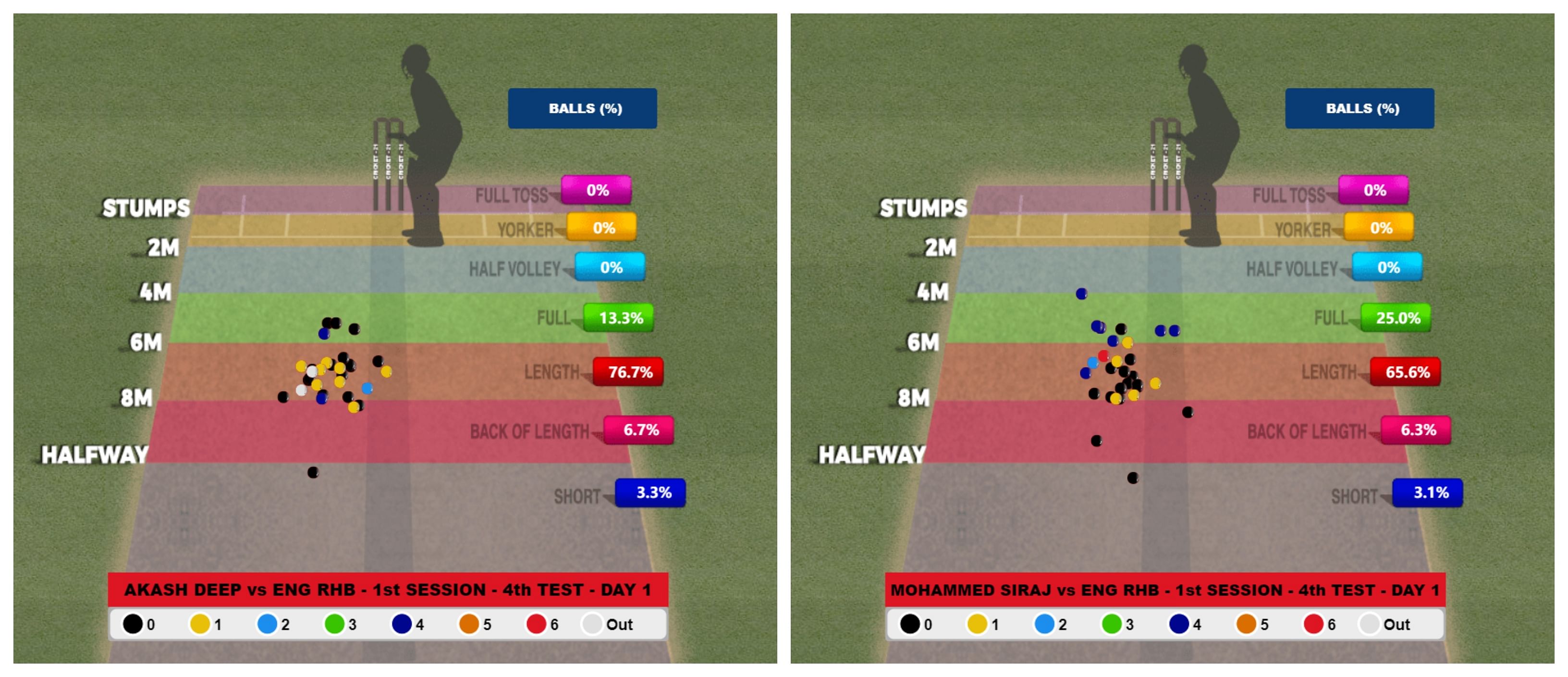 25% of the balls from Siraj in that first spell were full, with four boundaries. In contrast, there was Akash Deep, who, playing his first Test, didn’t err in his line and length with a spell for the ages on his Test debut.