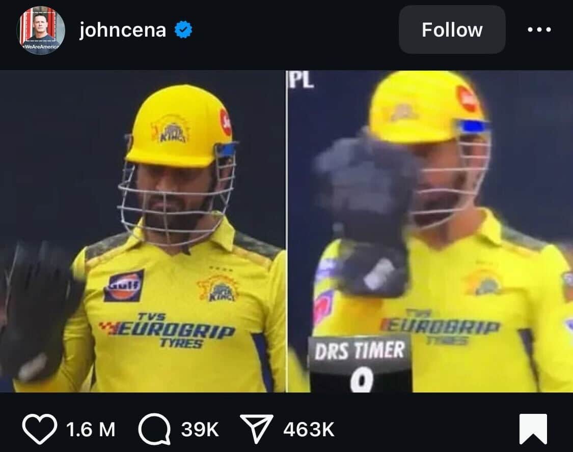 The latest post from John Cena on Indian cricket was made during the 2023 IPL when he posted two photos of MS Dhoni. In one image, he was behind the wickets in a helmet, and in the other, he was seen with his gloves in front of his face in what resembled the iconic John Cena move of ‘You can’t see me’.