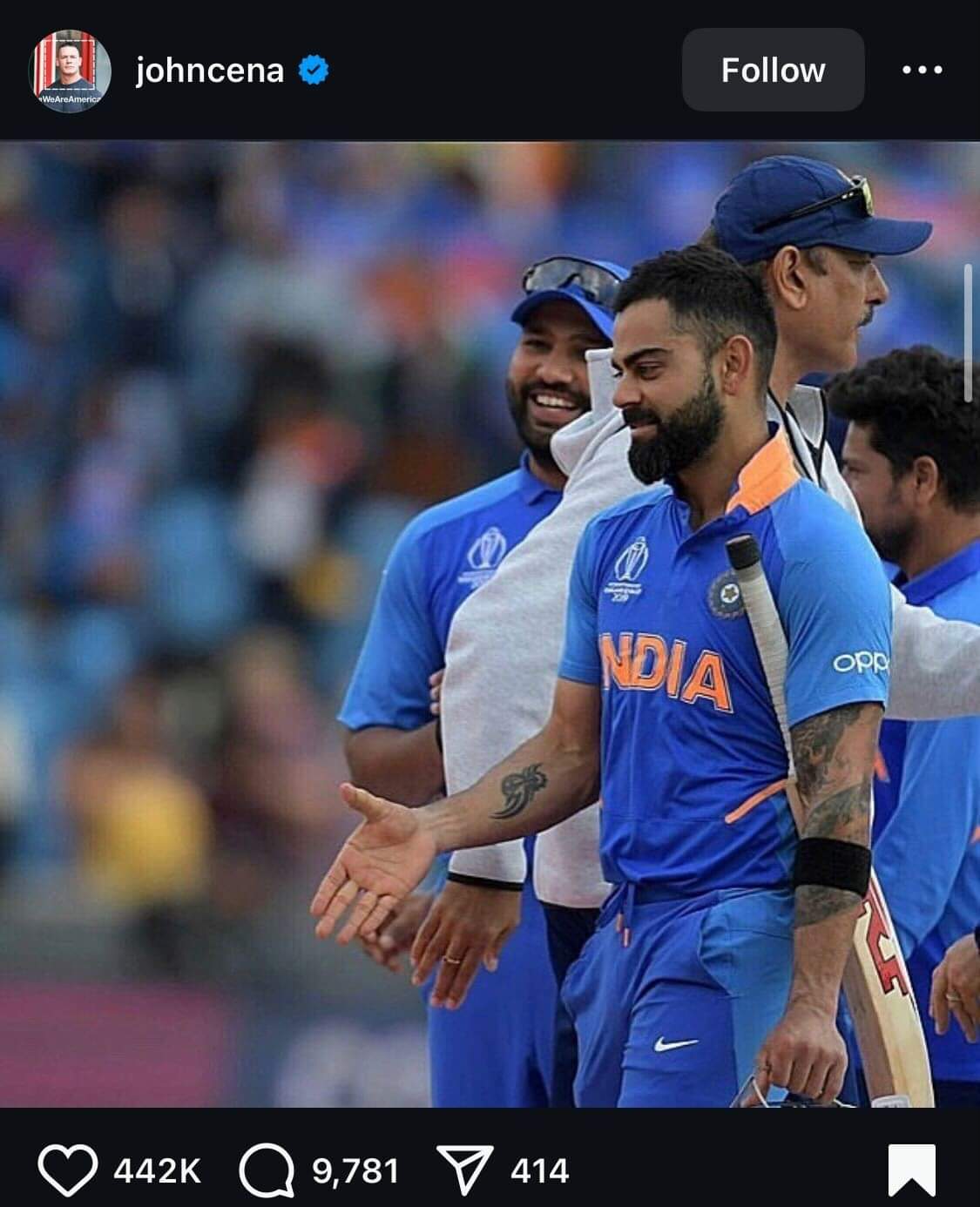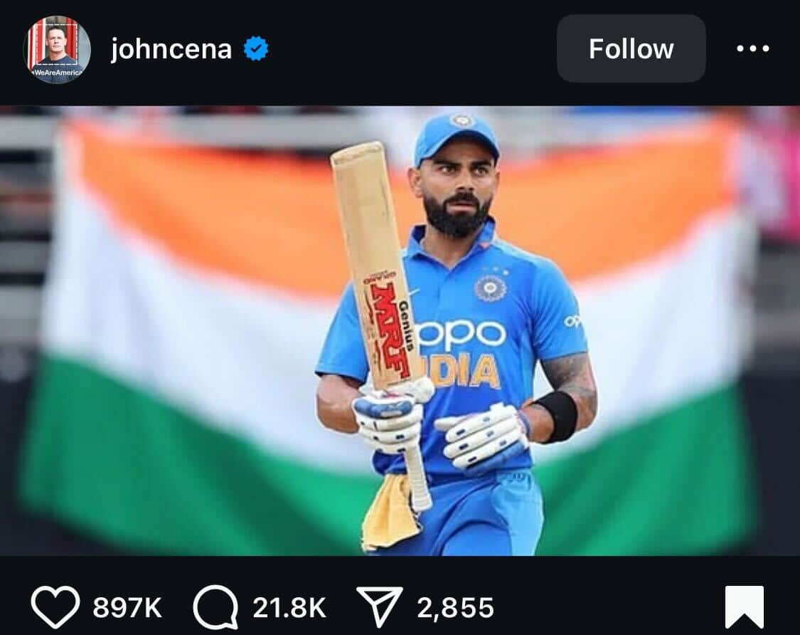 How? Well, known for his bizarre tendency to post absolutely random images on Instagram, Cena has also posted about Indian Cricket on his account in the past. Many Indian greats, including Virat Kohli and MS Dhoni, have featured on Cena's posts.
