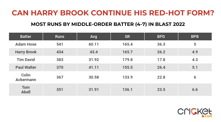 Interestingly, Harry Brook has just made the one T20I appearance thus far for the Three Lions, where he scored a 13-ball 10. The Yorkshire lad has scored 448 and is amongst the top ten run-scorers in the Vitality Blast but more importantly, strikes at 165.64. In addition to that, Brook is also the second-highest scorer for batters in the middle-order (4-7) during this year's Blast. That is essentially what has made him a front-runner for taking the Morgan position.