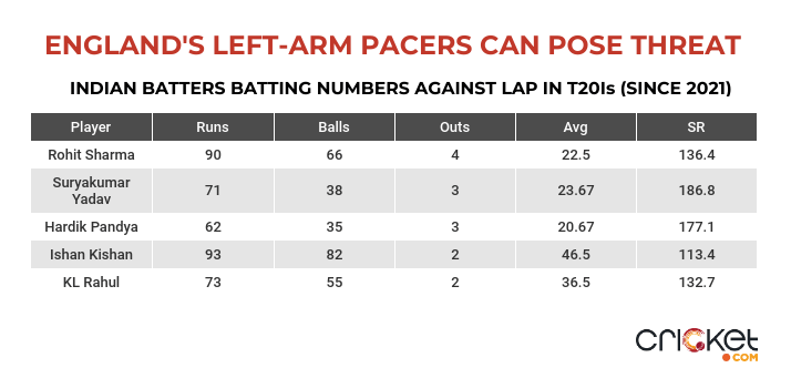 Since the start of 2021, the Indian batters have struggled against left-arm pacers. Rohit has been dismissed four times, Hardik and Suryakumar thrice. While Kishan has been dismissed just twice, his strike rate is just at 113.4, showing weakness. A lot of the match’s result could be on how the Indian batters neutralise the left-arm threat from England.