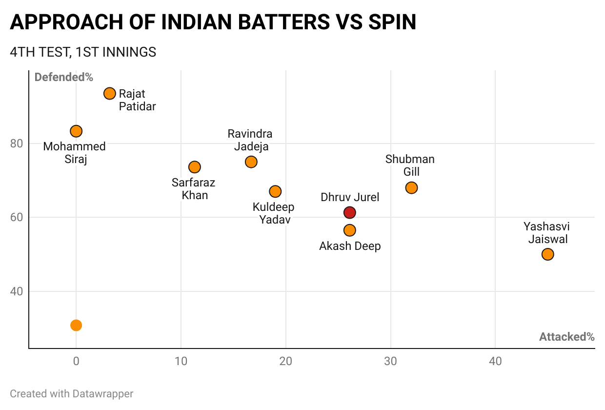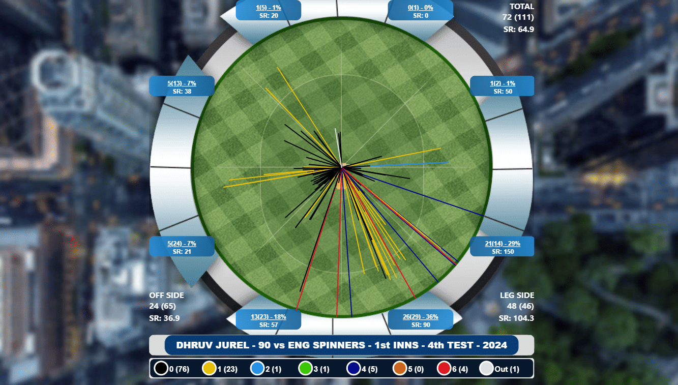 Jurel scored 72 off his 90 runs against spin, batting at a strike rate of 64.9. 65% of his runs against spin came in the mid-wicket and long-on region. On a pitch where the ball has kept low with slow turn, Jurel hammered four sixes in these regions, showcasing his natural hitting prowess. Indian spectators had seen it in the IPL, but Jurel replicated it at a crucial juncture in his first Test series. When Kuldeep Yadav was out, Jurel added another 54 runs with numbers 10 and 11 for the last two wickets.