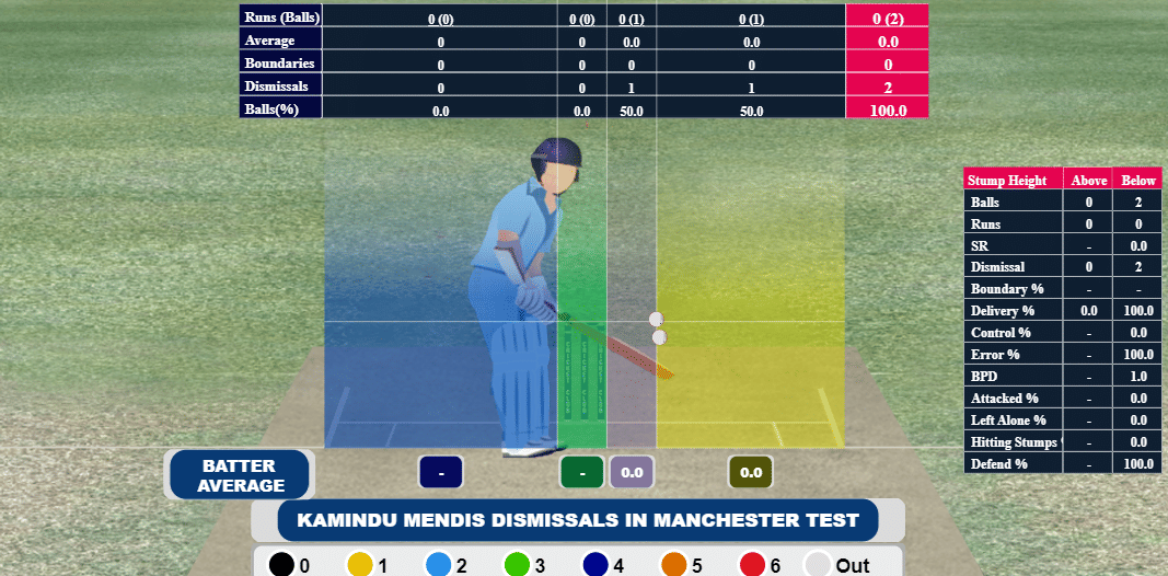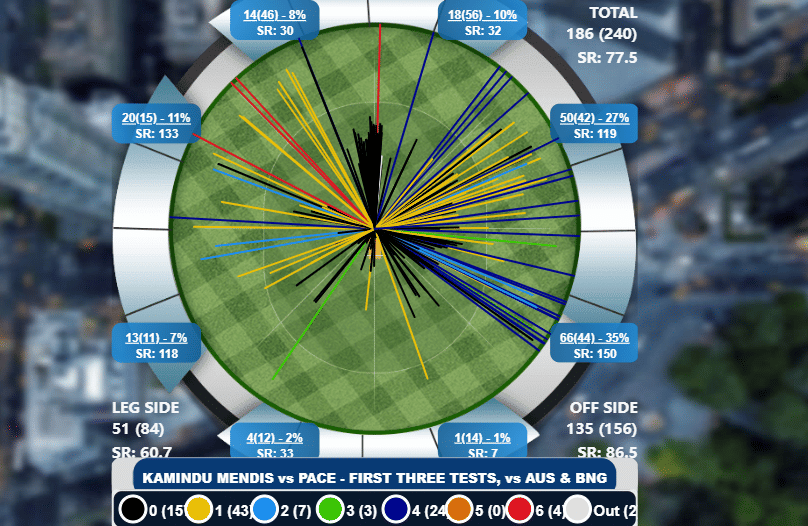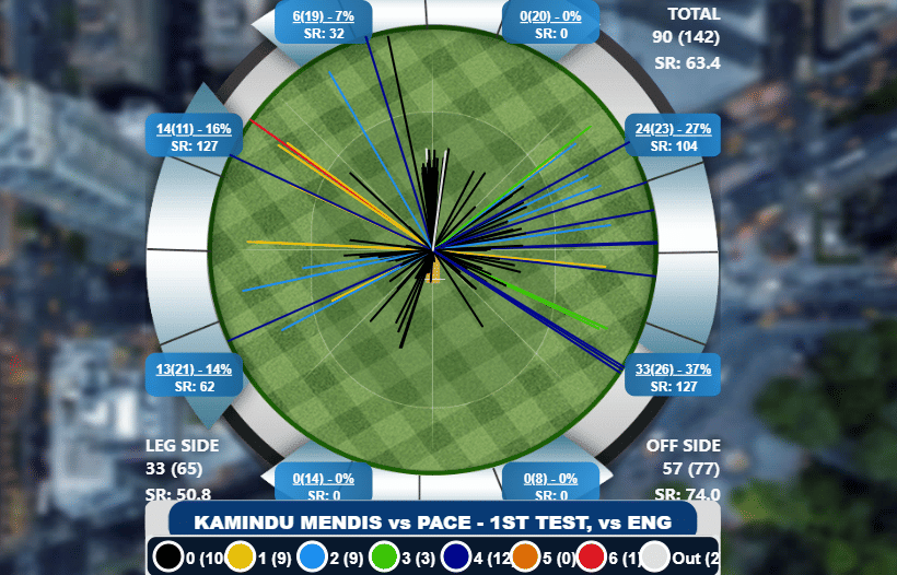 However, and quite surprisingly, Mendis doesn’t score anything down the ground. In Asia against pace, he had only 3% of his 186 runs between mid-off and mid-on. In Manchester, he didn’t score anything in that arc, including both pace and spin. 113 runs and not a single run in the V.