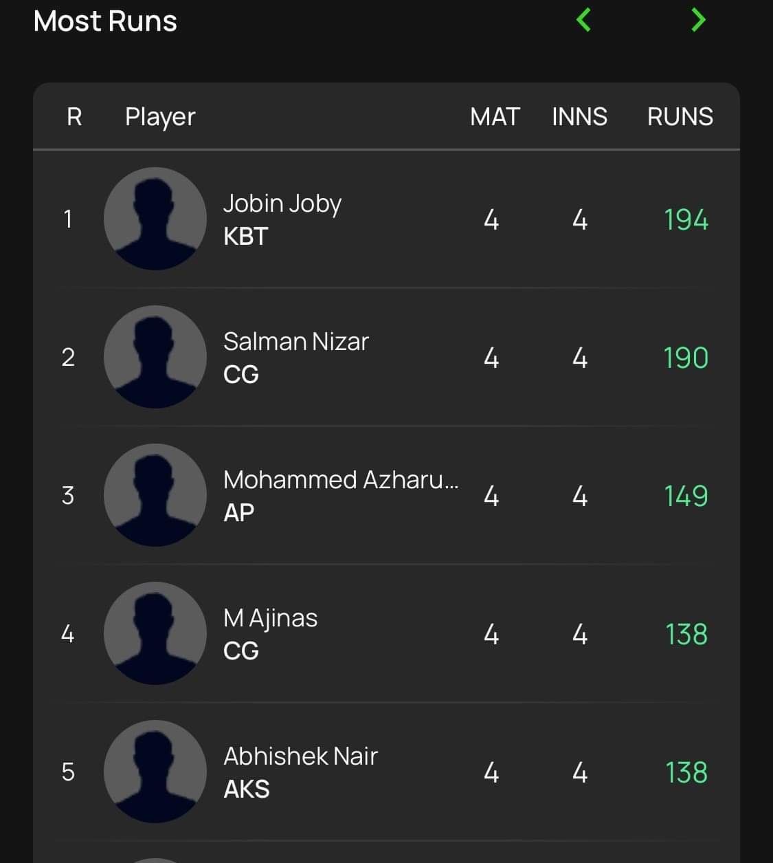 Jobin Joby of the Kochi Blue Tigers (KBT) is the leading run-scorer of the tournament, with 194 runs in four games. He is followed by Calicut Globstars’ Salman Nazir, who has 190 runs. Alleppey Ripples’ Mohammed Azaharuddin has 149 runs to his kitty from four games as well.