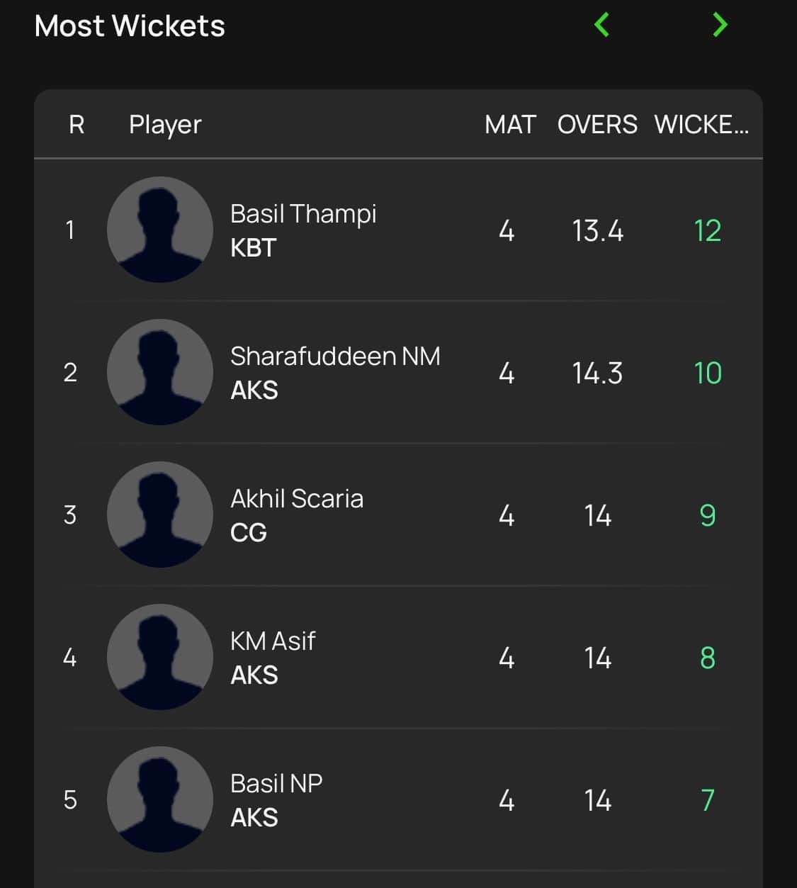 Kerala star Basil Thampi, who has played in the Indian Premier League (IPL) is the leading wicket-taker of the tournament so far. He has taken 12 matches in four matches for KBT. He is followed by the right-arm medium pacer NM Sharafuddeen (AKS), who has 10 wickets to his kitty.