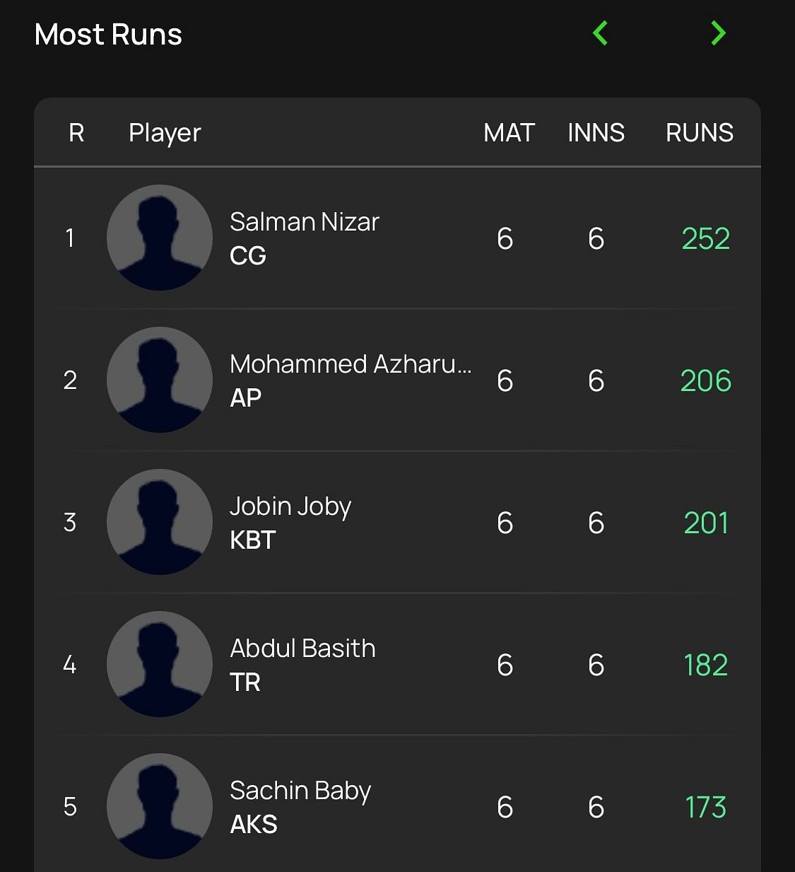 Among the batters, Jobin Joby of the Kochi Blue Tigers (KBT) has been displaced from the leading run-scorers charts by Salman Nizar of the Globstars from Calicut. He has 252 runs in six innings and is followed by Mohammed Azharuddeen of the Alleppey Ripples (AP).