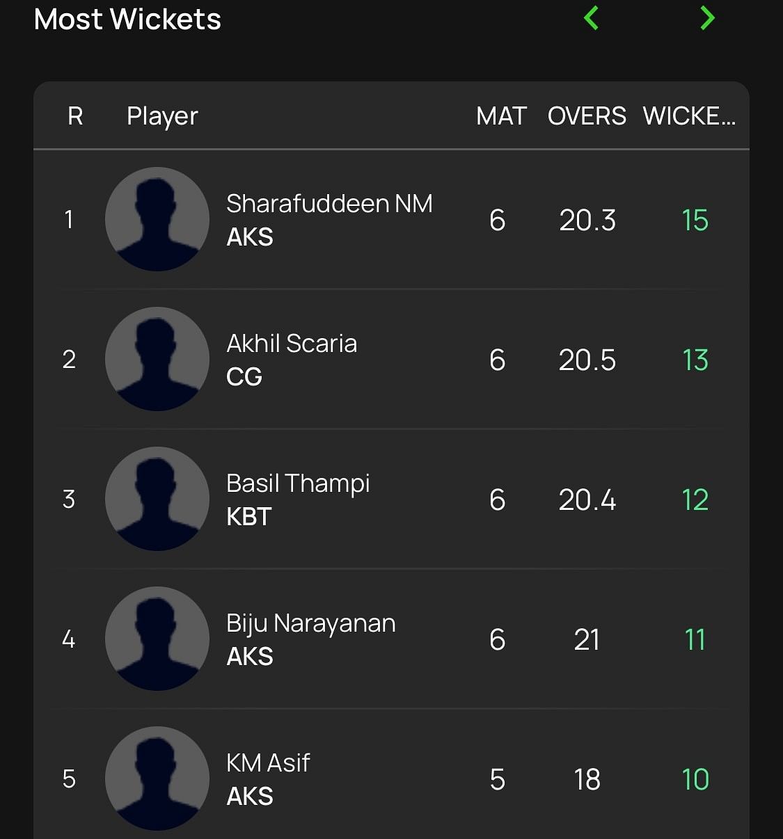 There is a change in the leading wicket-takers list as well. Basil Thampi, who was at the top after the first 12 matches, has now been replaced by Sharafuddeen NM of the AKS. Sharafuddeen has taken 15 wickets in six games and is followed by Akhil Scaria of CG, who has 13 wickets in an equal number of matches.