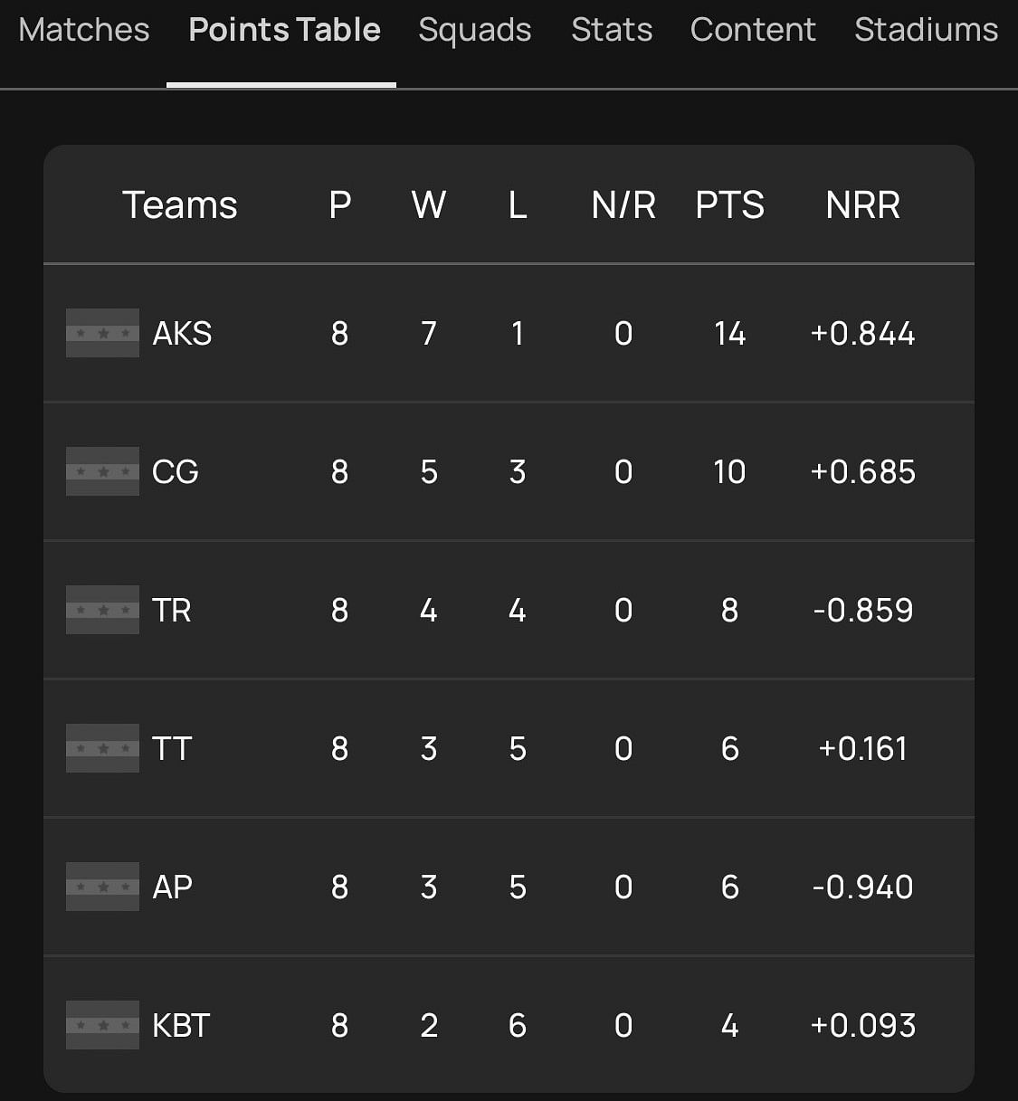 With just two rounds of matches left in the Kerala Cricket League (KCL) 2024, all the teams are going hard to secure the top-four spots and get themselves into the playoffs. After the eight matches, it is Aries Kollam Sailors (AKS) who remain at the top, having lost just one match in the entire tournament so far. Behind them are the Calicut Globstars with five wins and three losses.