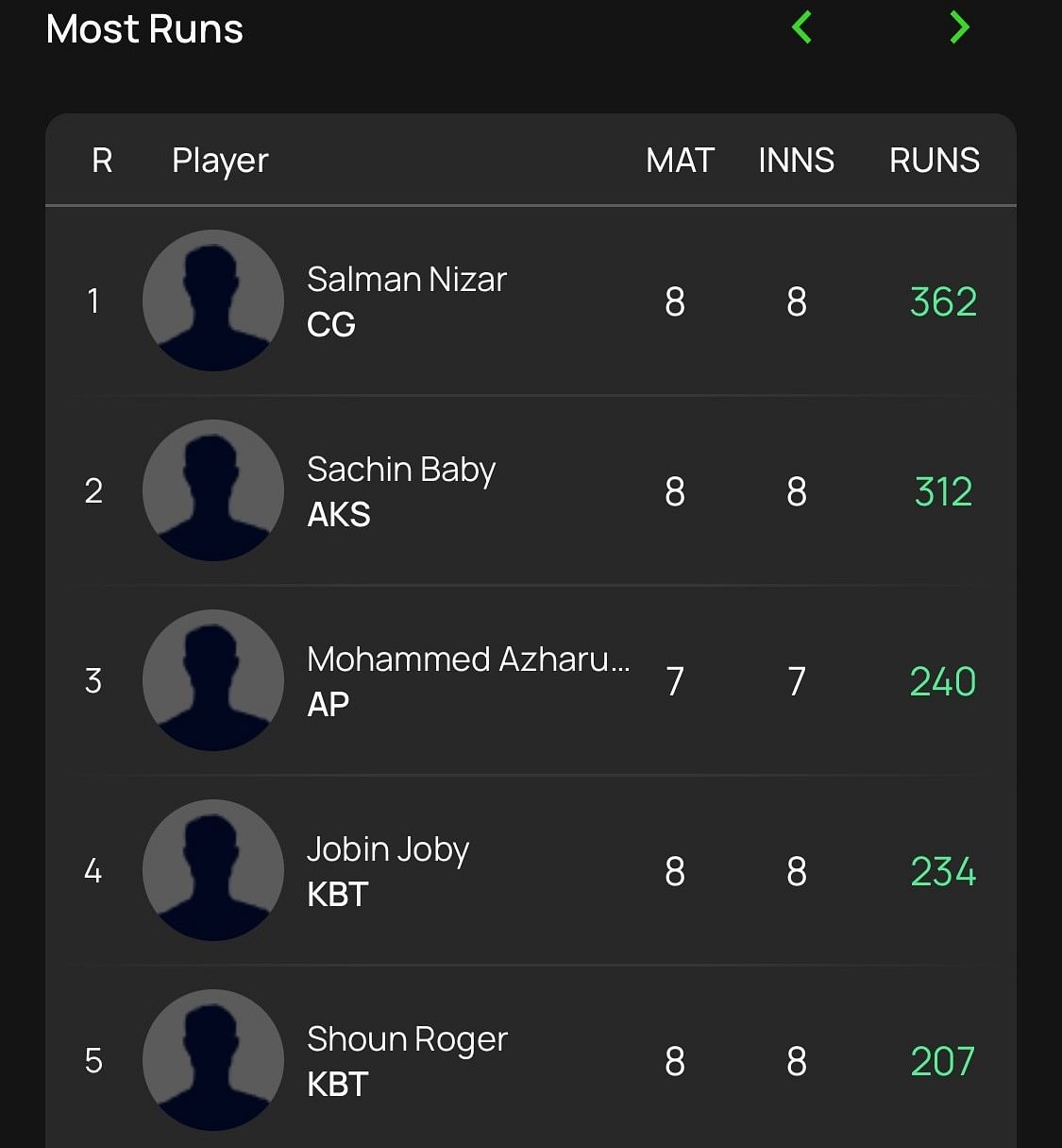 Salman Nizar continues to dominate the run-scoring charts as the Globstars batter has accumulated 362 runs in eight innings. He is followed by Sachin Baby of the AKS who has slowly climbed up the ladder with 312 runs in eight innings.