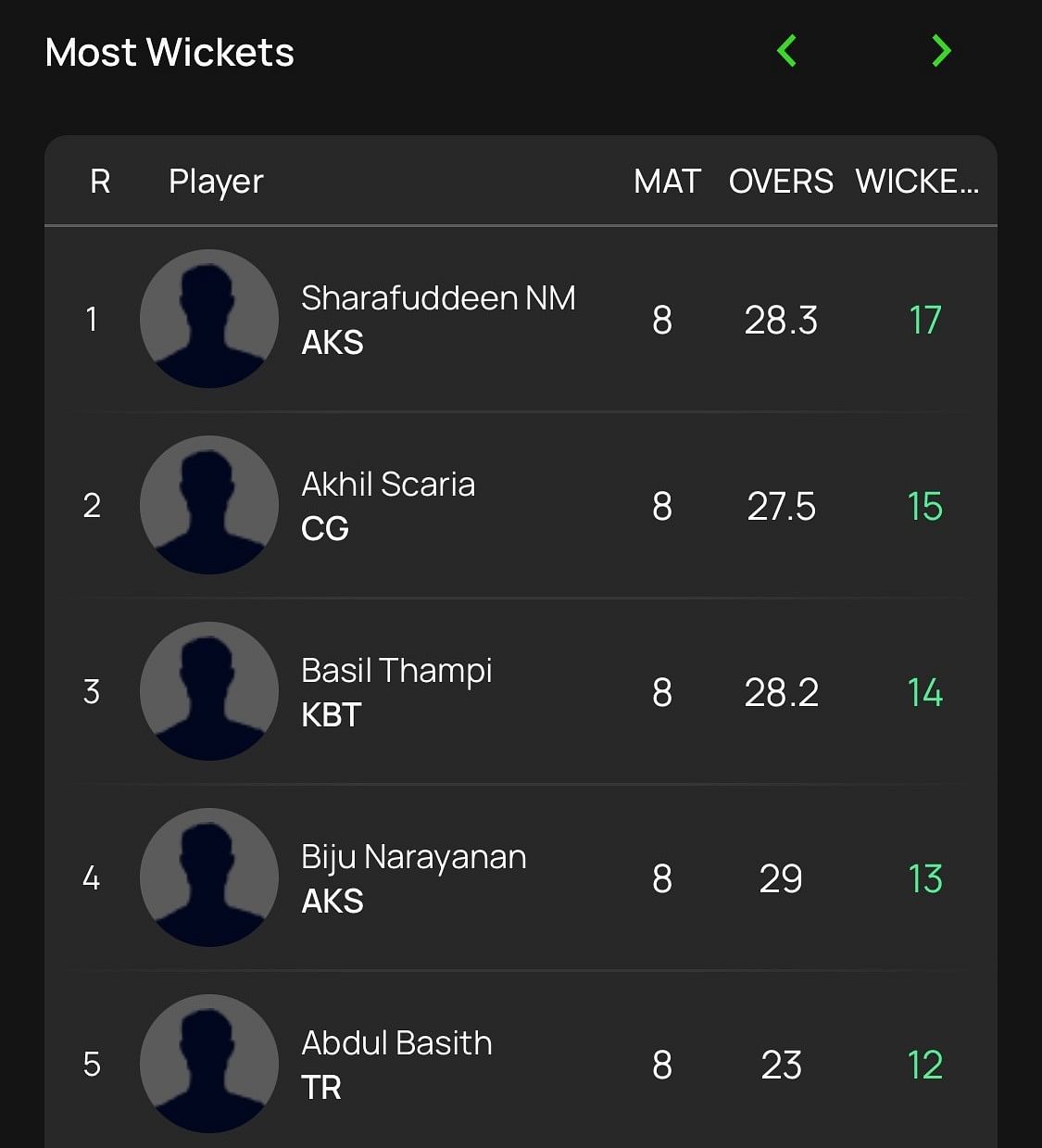 Sharafuddeen NM of the AKS has taken 17 wickets in 8 matches in just 28.3 overs and is the leading wicket-taker in the tournament. Chasing Sharafuddeen is Akhil Scaria of the Globstars with 15 wickets to his name in 27.5 overs of eight matches.