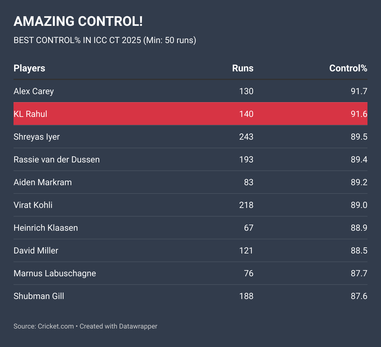 Even against the pacers, he was happy to wait for the ball to come to him and play it according to merit, and not by premeditating. He had a control percentage of 89.3 against pace and 93.1 against spin, making it a near-perfect tournament.