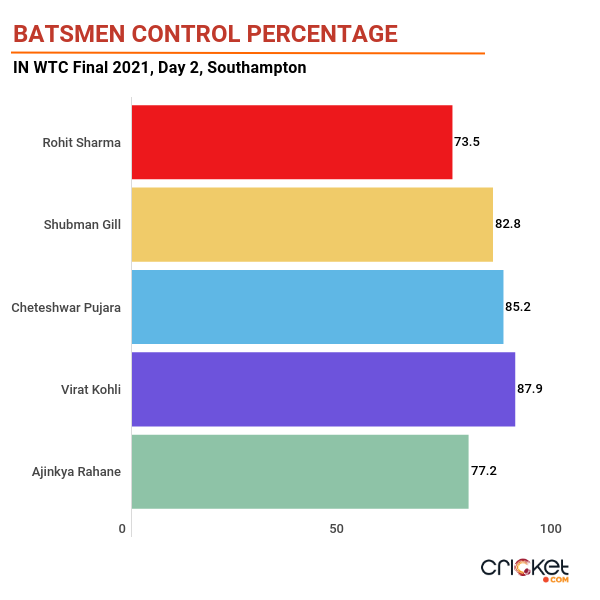 In the recently-completed England and New Zealand series, against Colin de Grandhomme, batsmen had a control percentage of 87.1 percent, the highest for a bowler. Thus one would’ve been rightfully wondering about him being at the forefront of the attack in the second session, but given Virat Kohli’s propensity to hurry on the front-foot against medium-pacers, it made perfect cricketing sense. Kohli was duly stuck in one end against CDG but never really looked in trouble.