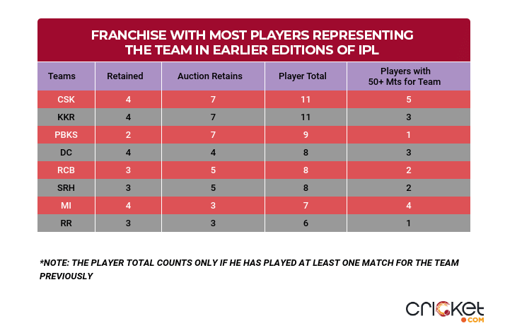 On the other hand, Punjab Kings have nine players who have represented the team and seven of them were brought back in the auction. Rajasthan Royals have the least number as they have only six players who had previously been a part of the franchise, three retained and three bought in auction. Delhi Capitals, Royal Challengers Bangalore & Sunrisers Hyderabad have eight players who have represented them in earlier editions and Mumbai Indian have seven.