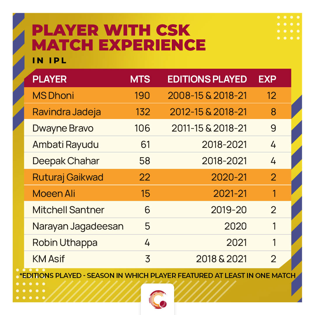 Ambati Rayudu (61) who made a shift to Chennai from Mumbai in 2018 has played over 50 matches for the team. After playing under Dhoni in the now-defunct Rising Pune Supergiants in 2016 & 2017, Deepak Chahar started his IPL journey in Chennai colors from 2018 and has played 58 matches. Rururaj Gaikwad, after his sensational 2021 season was one among the four retained players. Moeen Ali as well was retained before the auction on the back of a good 2021 season. Mitchell Santner, Narayan Jagadeesan, Robin Uthappa and KM Asif were brought back in the auction too.