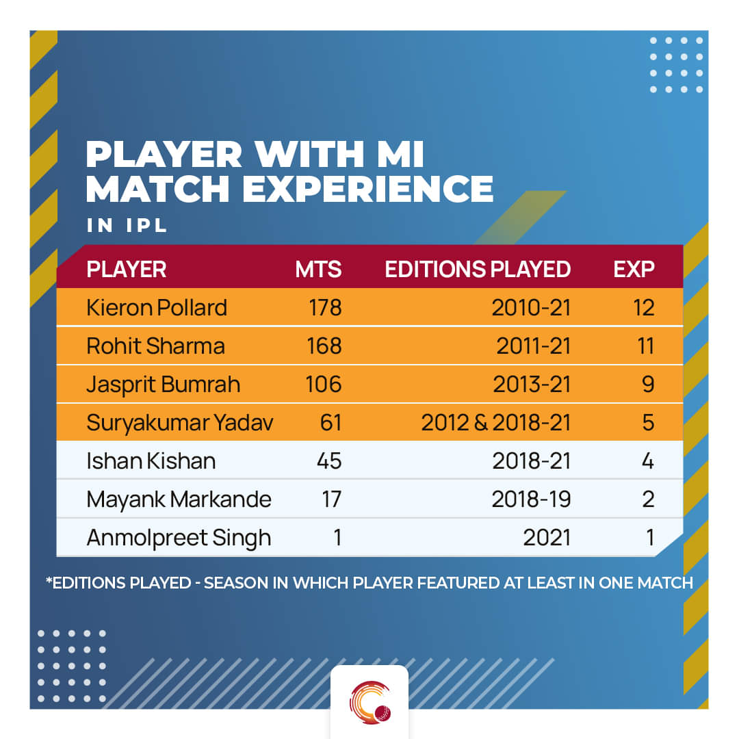 During the auctions, they went all-out for Ishan Kishan, but for none of their players from the 2021 squad did they break a sweat, apart from Mayank Markhande and Anmolpreet Singh. Hence, they have only seven players who have represented them in previous editions.