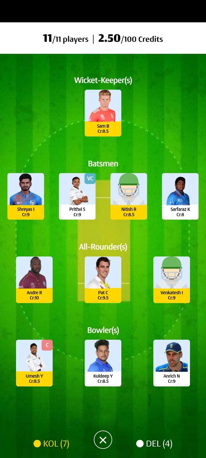 Kolkata Knight Riders: Ajinkya Rahane, Venkatesh Iyer, Shreyas Iyer(c), Sam Billings(w), Nitish Rana, Andre Russell, Sunil Narine, Pat Cummins, Umesh Yadav, Rasikh Salam, Varun Chakravarthy
