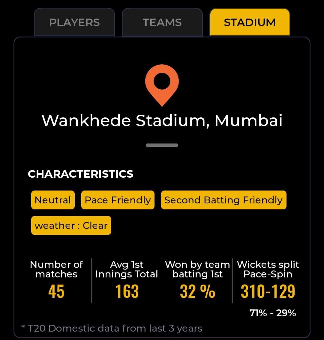 Mumbai’s Wankhede Stadium is a comparatively batting-friendly venue, with the average first innings score being 163.