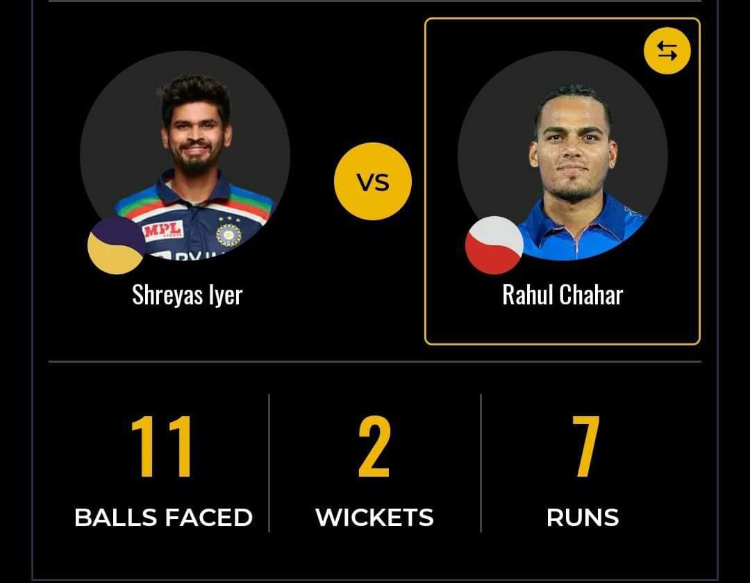 Leg spin has been the only bowling form to trouble Shreyas Iyer in IPL. 2019 onwards, he averages only 19.8 facing right-arm wrist spinners. Rahul Chahar has accounted for two of his 12 dismissals against leg-spin. Iyer averages only 3.5 versus Chahar which underlines the battle to watch out for.