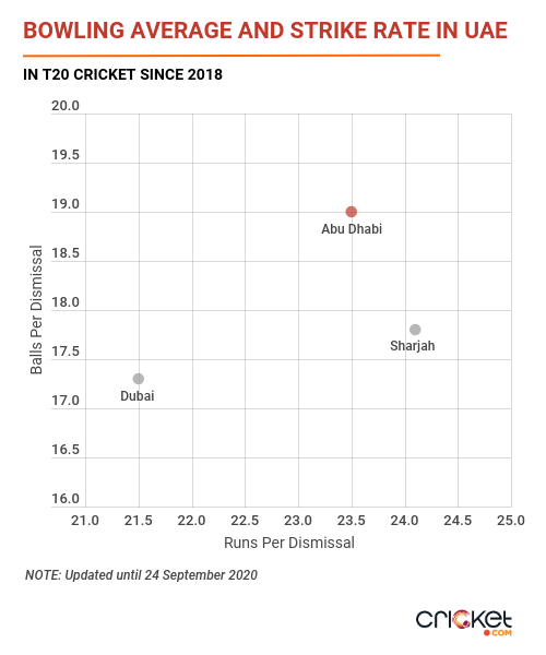 As far as batting is concerned, the run-rate in Abu Dhabi (7.4) is almost the same as Dubai (7.5) and batsmen have scored 23.5 runs for every wicket in T20s since 2018.