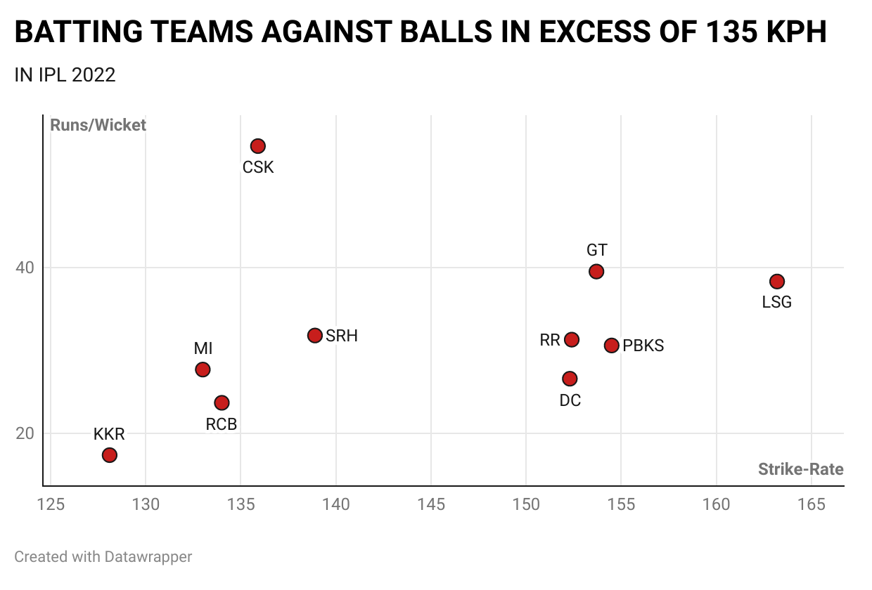 Surprisingly, all these deliveries were only in mid 130s. Kolkata suffer the lowest strike rate and average against balls bowled at 135 kph or above.