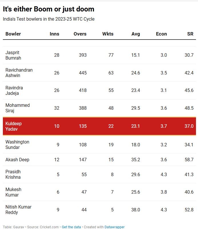 However, what’s really troubling is the record of the third and fourth pacers on this list, Akash Deep and Prasidh Krishna. While the latter has played only three Tests and got eight wickets at 29.6 runs apiece, Akash Deep has averaged 35.2 with the ball in the last WTC cycle.