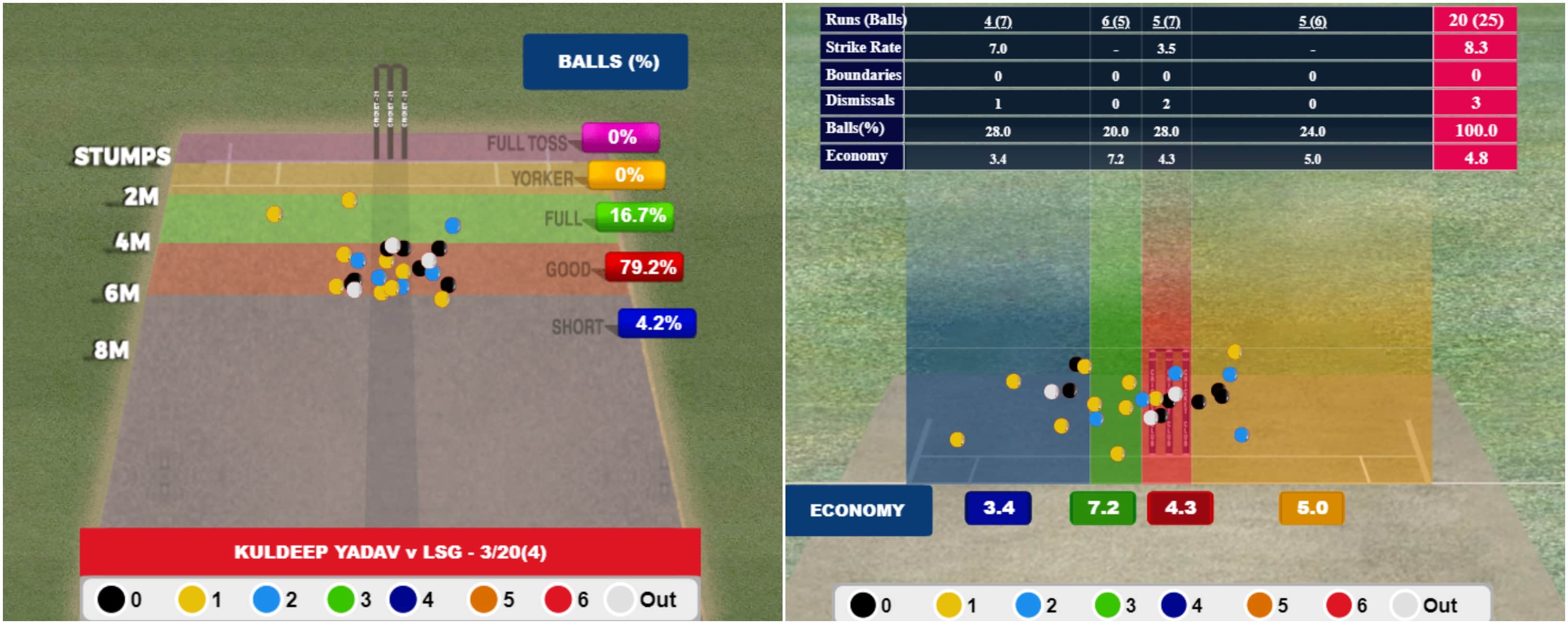 If you look at his pitch map and beehive from today’s game, you’ll find that this glitzy show of skill from Kuldeep was built on the discipline of his line and length, as he hardly erred away from the good and full-length areas.