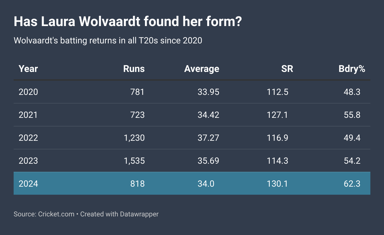 But then, over the last two years, Wolvaardt has consciously worked on her power-hitting game and has hit the right notes, with a strike rate of 130.1 in 2024 (all T20s), unprecedented from her game before.