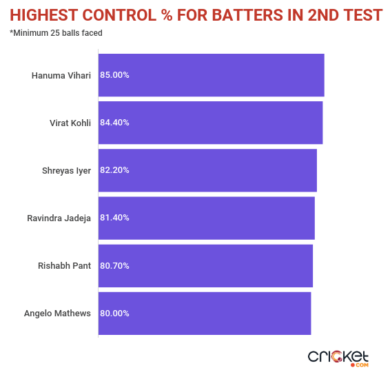 On paper, 31 and 35 might look like slightly underwhelming scores that do not deserve a great deal of praise. But across the 160 balls he faced in the Test, on a wicket where bowlers had the clear edge, Vihari looked as assured and comfortable as anyone did. His control percentage of 85.00% was the highest for any batter that faced more than 25 balls in the Test.