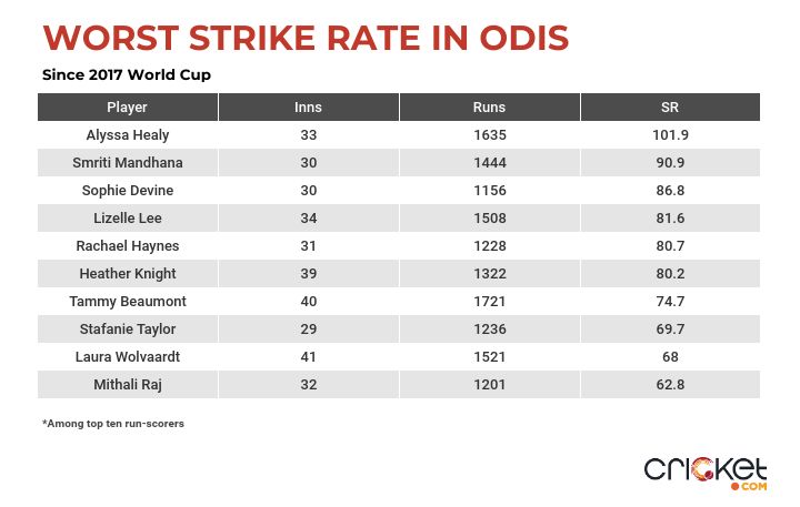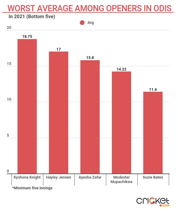The right-handed batter struggled with her form and fitness through the year and scored 57 runs in five innings at an average of 11.4, which is the worst among openers with a minimum of five innings.