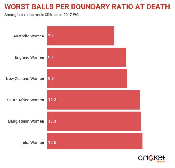 With the Indian team not having an explosive batter down the order, the team has struggled to find the ropes at the death and scored a boundary every 10.5 deliveries between overs 41-50, the worst among the top-six nations.