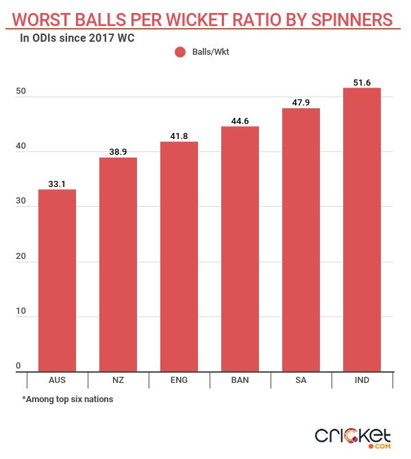 Over the years, India have been heavily reliant on their spinners to create inroads in the middle overs and restrict the flow of runs. However, in ODIs since the 2017 World Cup, the Indian tweakers have scalped a wicket every 51.6 deliveries, the worst among the top-six nations.