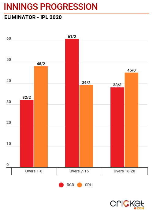 Put it to the wicket of Warner or the tactfulness of RCB spinners, SRH's innings nosedived in the middle phase. There was only one boundary in the period of nine overs and more than 50% dot balls.