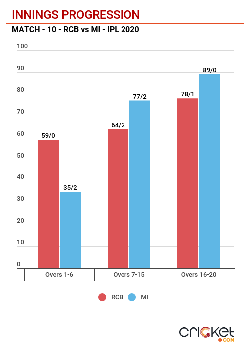 Bangalore's batting went through a dip in the middle overs where they accumulated only 37 runs in seven overs between over number seven and 13. The lowering run-rate was sponsored by Finch's dismissal (for a 35-ball 52) and tentative knock from the skipper Virat Kohli who batted like a shadow of himself. He trudged to 3 runs off 11 balls before lending catching practice to Rohit Sharma at cover off a flighted delivery by Rahul Chahar. A second-wicket stand of 11 runs off 20 balls allowed Mumbai to be back in the game.