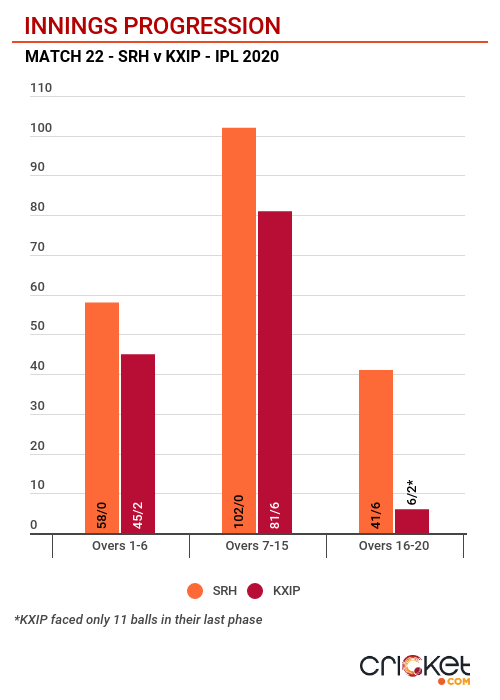 Bairstow and Warner were in their elements again after underwhelming returns in the last few games. Warner, especially, showed intent stroking Sheldon Cottrell for two boundaries in the first over. Bairstow appeared fluent, piercing the gap through the off side a number of times during the field restrictions. The pair moved largely at 10 runs per over in the Powerplay amassing 58 runs without being separated. The KXIP bowling trio of Cottrell, Mohammed Shami and Mujeeb Ur Rahman - bowling two overs each in the Powerplay - could only induce a couple of half chances.