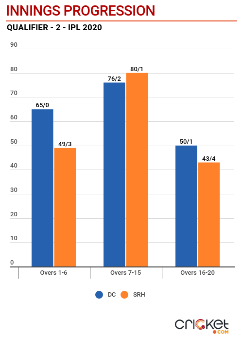 The decision to open with Marcus Stoinis paid rich dividends. With a stroke of luck, he changed Delhi's fortunes at the top of their innings, scoring 33 runs from 21 balls in the Powerplay. His attacking strokeplay also freed up Shikhar Dhawan to take over SRH bowling later. Evidently, Delhi posted their best Powerplay score this season - 65 for no loss.
