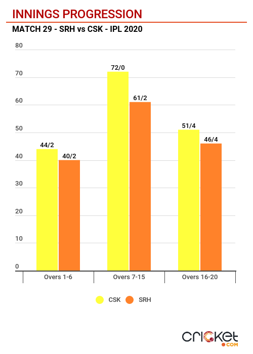After Curran's departure, CSK's scoring rate tanked. In the five overs after the Powerplay, Watson and Ambati Rayudu added 30 runs.