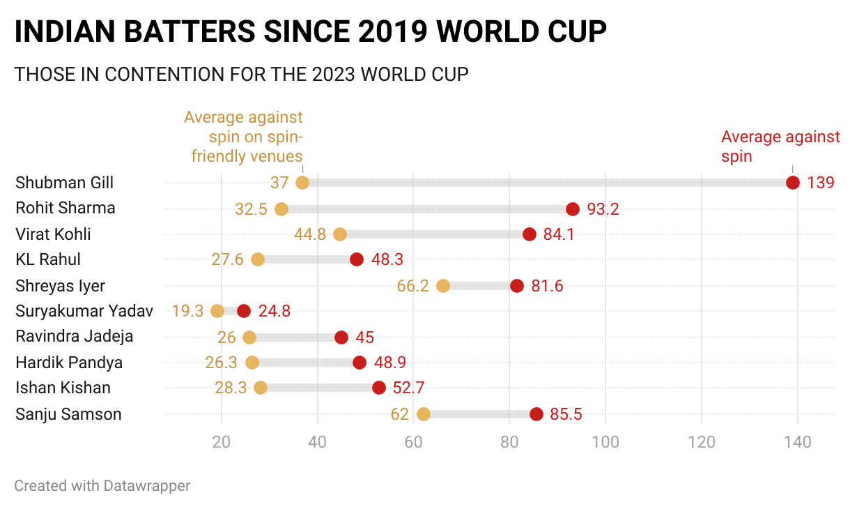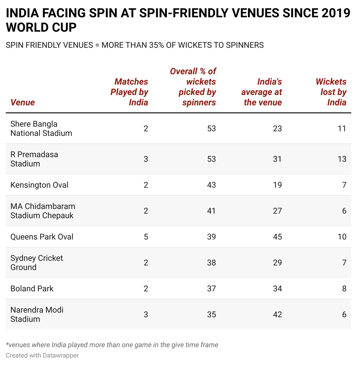 India have beefed up their numbers by pasting spinners on pitches that have had little to no assistance for the slower bowlers, like you find in New Zealand, Australia and many venues in India itself. Since the 2019 World Cup, the Indian team average 46.9 against spin. But this number falls considerably at venues that have been spin-friendly for the last four years at least.