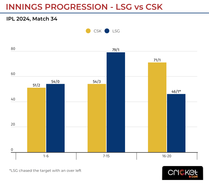 KL Rahul forged a 134-run opening stand with Quinton de Kock to make the run-chase a cakewalk for LSG. De Kock struggled to time the ball throughout the innings, but Rahul’s controlled aggression never let the game slip away. He was on 34 at the end of the powerplay, his highest powerplay score for LSG in IPL.