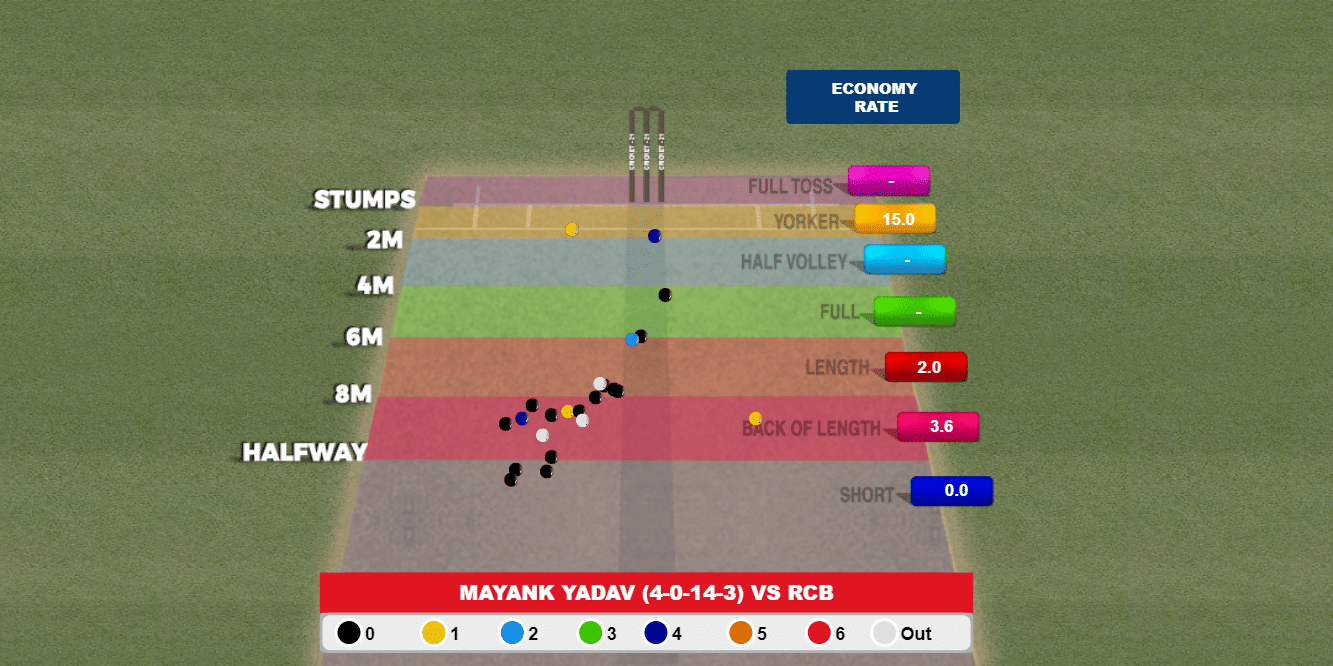 Mayank Yadav’s spell of 3/14 in four overs derailed RCB’s run chase. He bowled a heavy percentage of balls on the shorter side of the pitch. And the economy rates in those zones was ridiculous. He won his second Player of the Match award in a row.