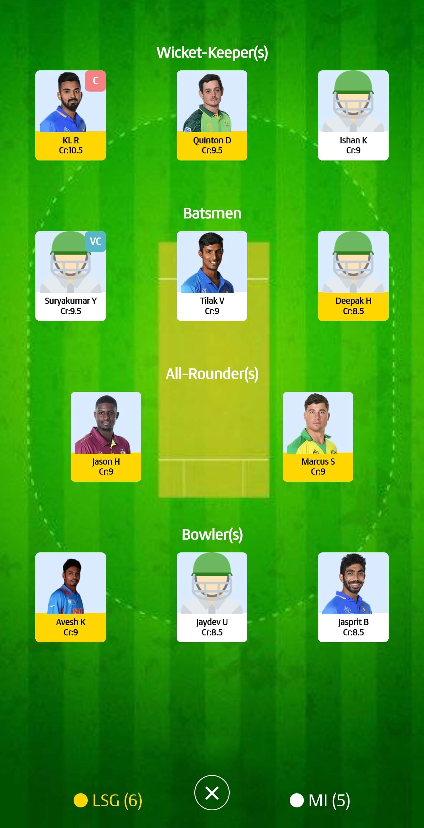Lucknow Super Giants: KL Rahul (c), Quinton de Kock (wk), Marcus Stoinis, Deepak Hooda, Ayush Badoni, Krunal Pandya, Jason Holder, Krishnappa Gowtham, Dushmantha Chameera, Ravi Bishnoi, Avesh Khan