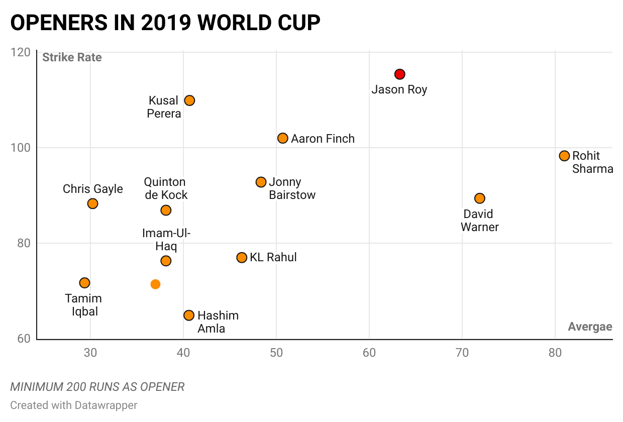 The return of a half-fit Roy stormed England into the final. He had the highest strike rate for an opener in that World Cup: 115.4. He also averaged 63.3. The only games England lost were when Roy was not playing or when he failed once: against Pakistan.