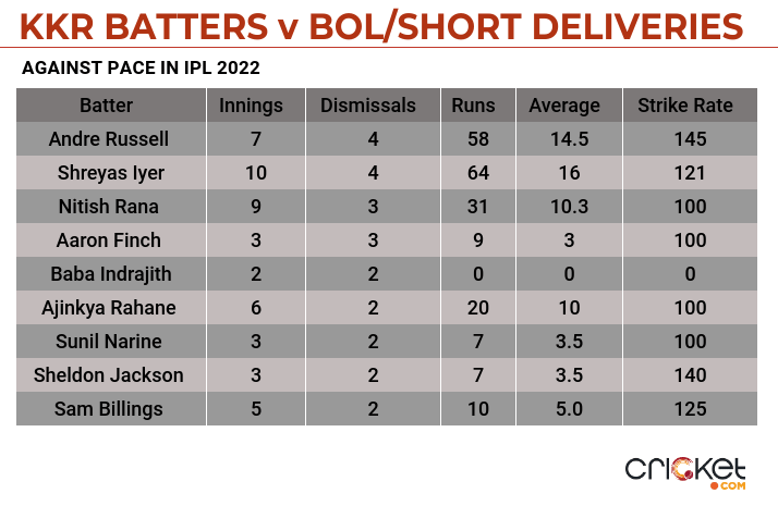 Two of their most important batters - Shreyas Iyer and Andre Russell - have got out to the short ball ploy four times each this season, the joint-most dismissals for a batter on such deliveries against pace. In fact, nine KKR batters have got out to back of length/short balls against pace twice or more times this season. Malik, Jansen and Kartik Tyagi, you know what to do!