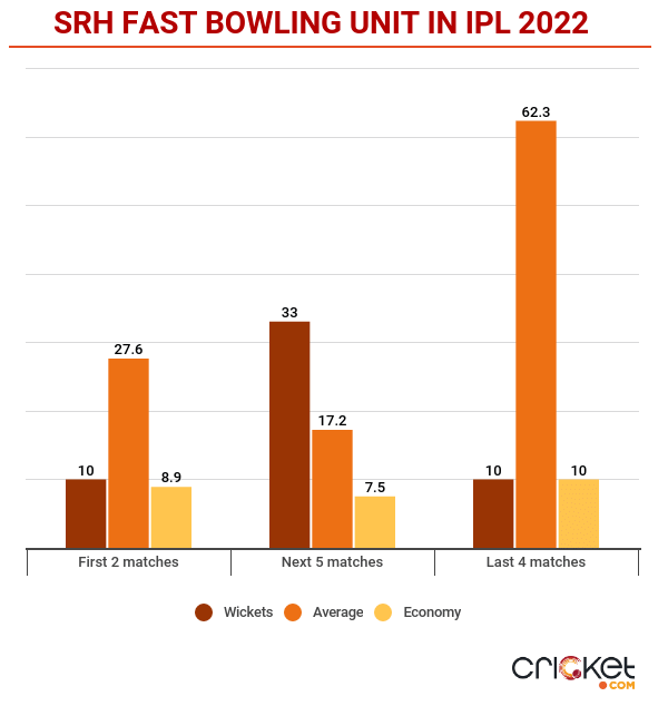 The above graphic tells you the entire story. During Hyderabad’s five-match winning steak, Bhuvneshwar Kumar, Umran Malik, Marco Jansen and T Natarajan were consistently delivering and were making things easier for their batters. However, a lot has changed in the last few games. Jansen has been dropped after a couple of rough outings, while Natarajan has missed the last two games because of an injury. Bhuvneshwar has been economical but has only picked up one wicket in the last four matches. Meanwhile, Malik has leaked runs at 12.5 in the last three encounters and hasn’t picked up a single wicket. This all will have to change quickly if SRH are looking for a turnaround.