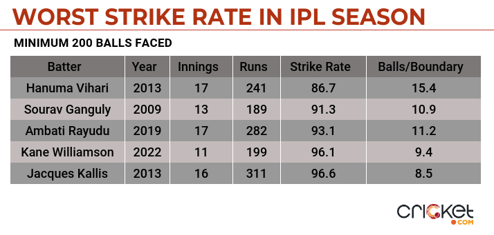 It wouldn’t be wrong if we say Williamson has been the worst opener in this competition. Yes, there are some openers and quality batters who have struggled to get runs but none of them have had as negative an impact as Williamson. The right-hander from New Zealand has managed only 199 runs in 11 innings at a horrible strike rate of 96.13. Amongst batters who have played at least 200 deliveries this season, Williamson clearly has the worst strike rate. In fact, if you take the same criteria, he has the fourth-worst strike rate for a batter in an IPL season.