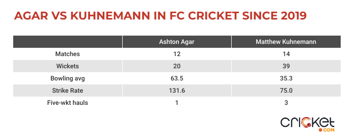 Agar was shoe-horned into the squad on the basis of his experience and white-ball exploits but the Western Australian, at the FC level, has been outperformed by Kuhnemann on all fronts.