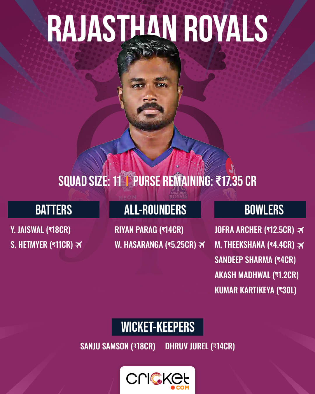 The Jaipur-based franchise have 11 players in their squad but are yet to find an opening partner for Yashasvi Jaiswal, an all-rounder at number seven and a solid backup for Archer. So RR have work to do on the second day. So far, their side is composed of Indian batters and overseas bowlers.