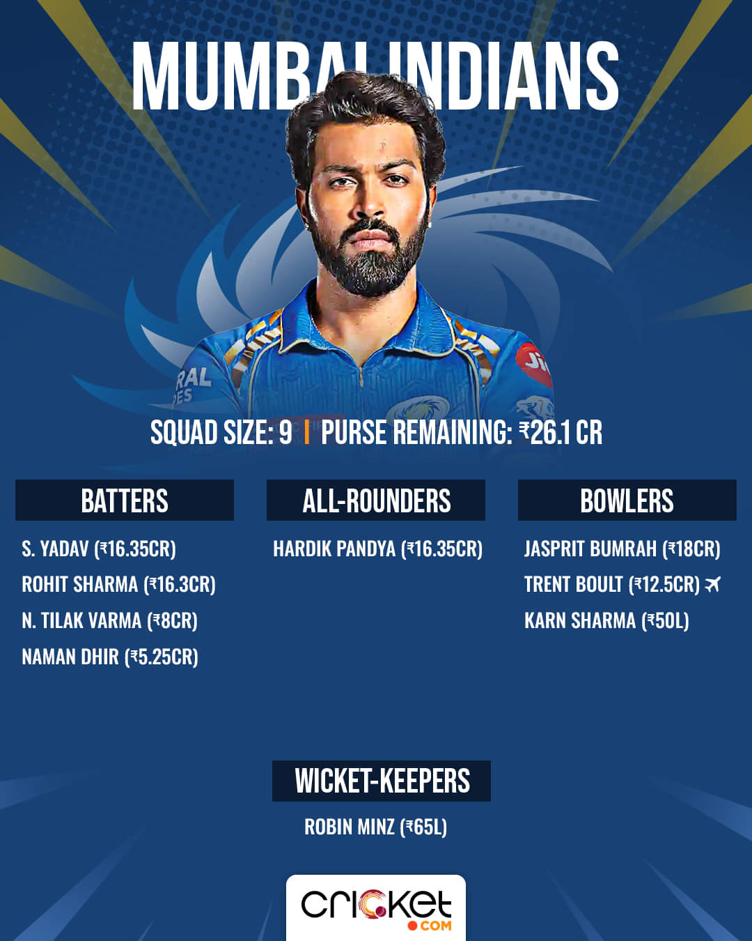 Presuming Robin Minz is a backup wicketkeeper, MI have three slots left in their XI, and they can reserve them all for overseas players given Boult is the only foreign player in their squad of nine so far. They could well be saving for Sam Curran.