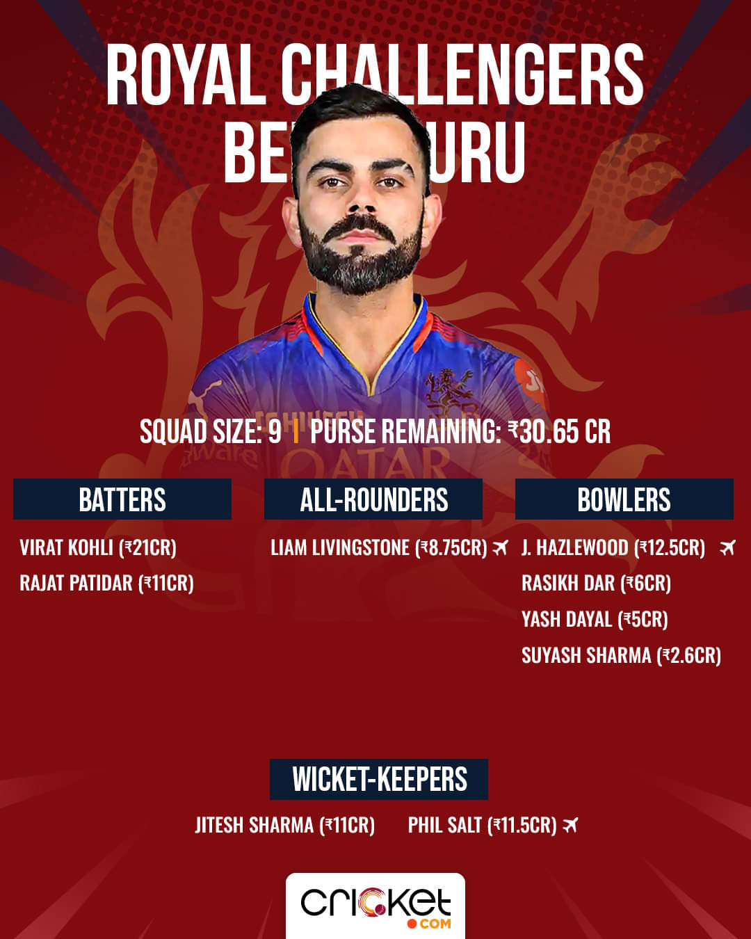 RCB still have 30.65 crore left to spend with only nine players in the bag. They must be waiting for a few big guns on the second day.
