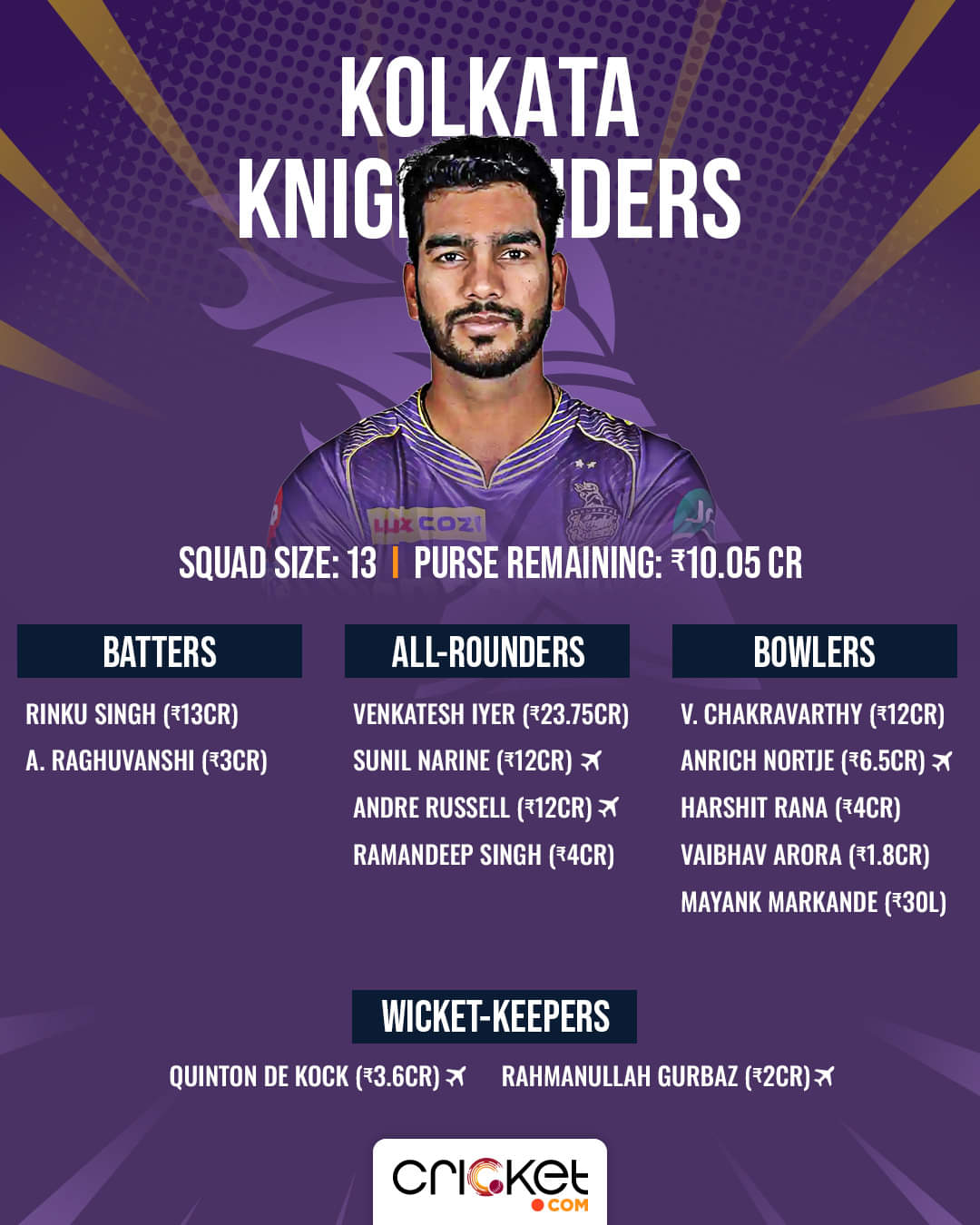 KKR followed the trend of buying their old players back, purchasing Venkatesh Iyer, Vaibhav Arora, Rahmanullah Gurbaz and Angkrish Raghuvanshi.